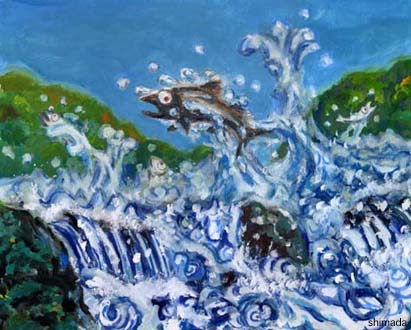 鮭と渓流の風景を水彩画で表現してみました。土器はこのような風景をデザインしたものだと思います。