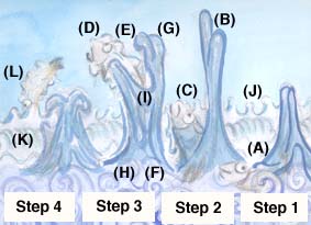 Step3.鮭が高く跳び段差を越える瞬間です。一連の動作の中で最も感動的な場面です。造形的には鉢の外側が下流、内側が上流を意味しています。この場面が「火炎土器」の基本的な造形イメージです。